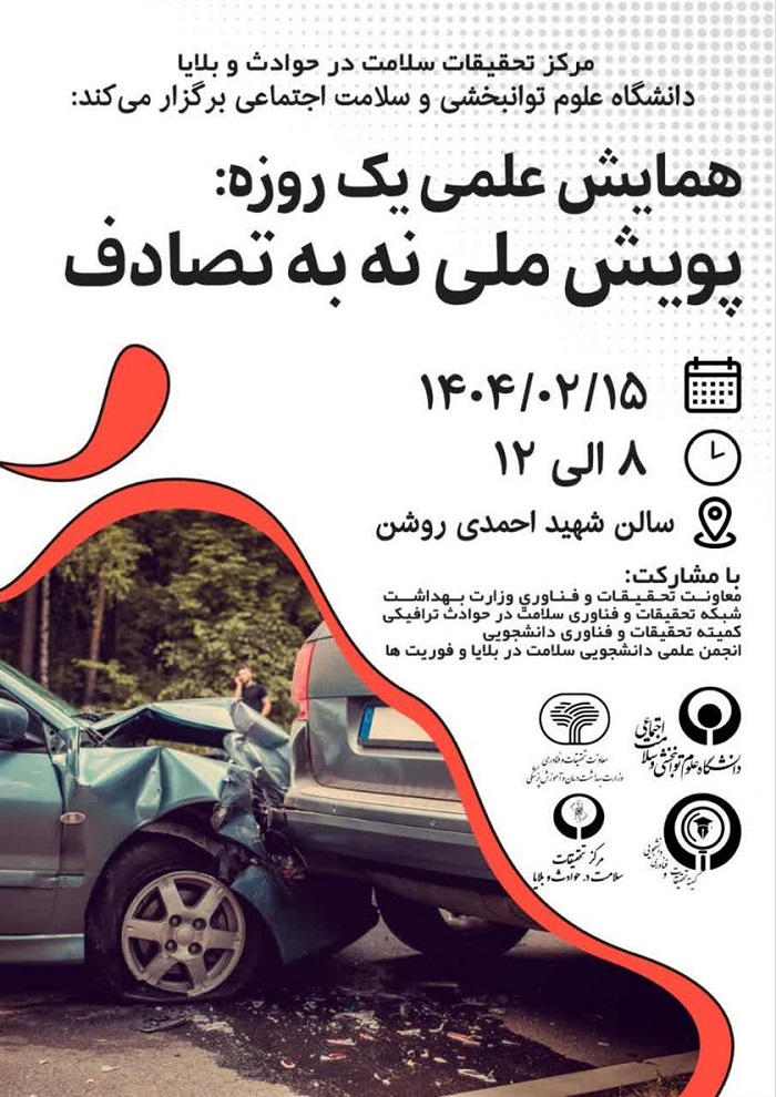به اطلاع اعضای هیأت علمی، دانشجویان و کارمندان می رساند، دانشگاه علوم توانبخشی و سلامت اجتماعی در نظر دارد سمینار یک روزه با موضوع " نه به تصادف " را با امتیاز بازآموزی در تاریخ 15 اردیبهشت 1404 برگزار نماید.