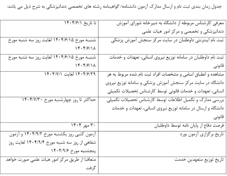 ثبت نام داوطلبان متقاضی شرکت در آزمون دانشنامه/ گواهینامه رشته های تخصصی دندانپزشکی سال ۱۴۰۴