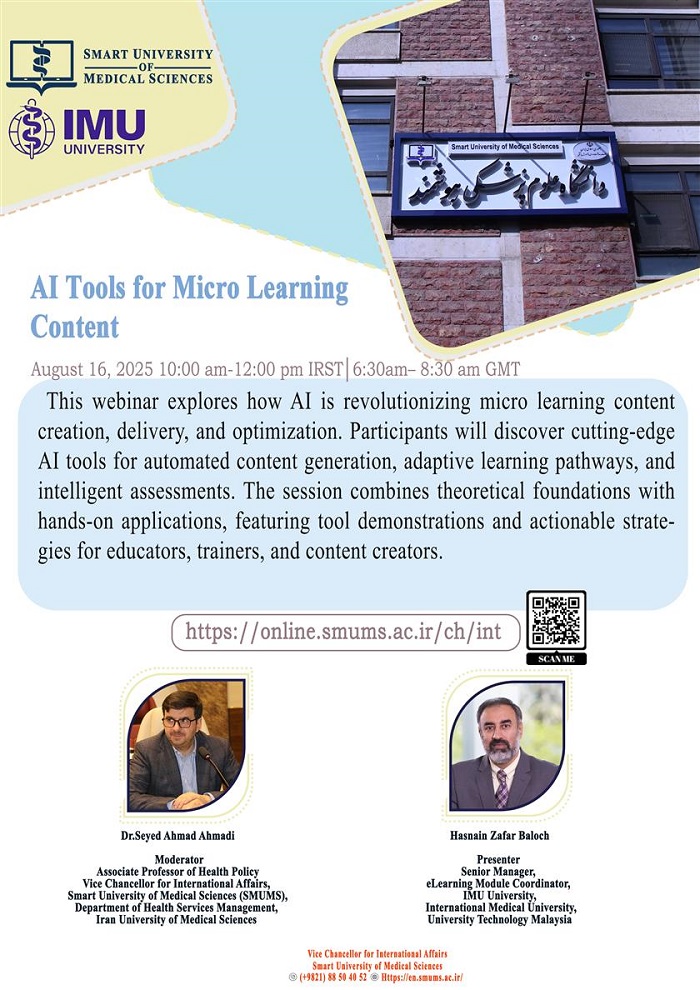 به اطلاع اعضای هیئت علمی، دانشجویان و سایر علاقه مندان می رساند، دانشگاه علوم پزشکی هوشمند در نظر دارد، سومین و آخرین وبینار بین المللی این سلسله رویدادها را با هدف تکمیل مباحث و ارائه آخرین یافته ها در حوزه فناوری های نوین آموزشی با عنوان " Al Tools for Micro Learning Conten " با سخنرانی جناب آقای حسنین ظفر بلوچ، مدیر ارشد یادگیری الکترونیک دانشگاه بین المللی پزشکی مالزی (IMU) به صورت بر خط برگزار نماید.